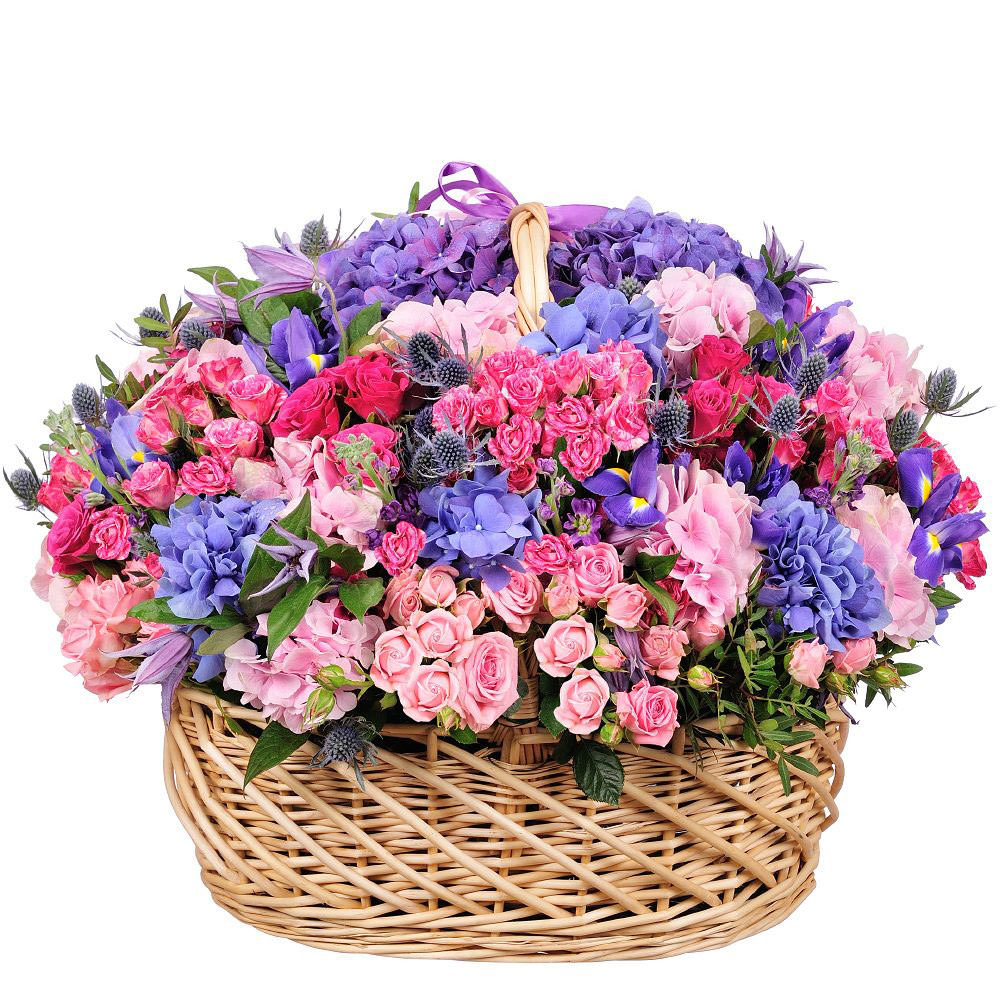 Роскошная корзина с миксом кустовых роз в нежных розовых оттенках, гортензией и элегантным эрингиумом создаёт атмосферу утренней свежести. Плетёная корзина из натуральных материалов подчёркивает природную красоту композиции. Возможны варианты оформления в корзине из лозы или ротанга. Прекрасный подарок для любимой на годовщину или день рождения.