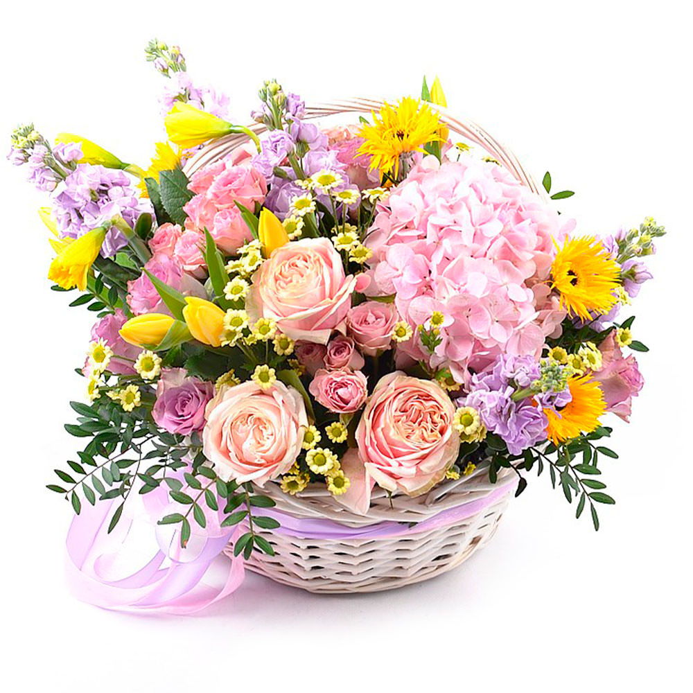 Яркая композиция из желтых гербер и тюльпанов, розовых роз и гортензий, дополненная сиреневой маттиолой и нарциссами, создает атмосферу весеннего настроения. Корзина выполнена из белого плетеного материала, что подчеркивает нежность и изящество цветов. Возможны альтернативы оформления: корзина из лозы или с тканевой отделкой. Прекрасный подарок для любимой на 8 марта или на день рождения.