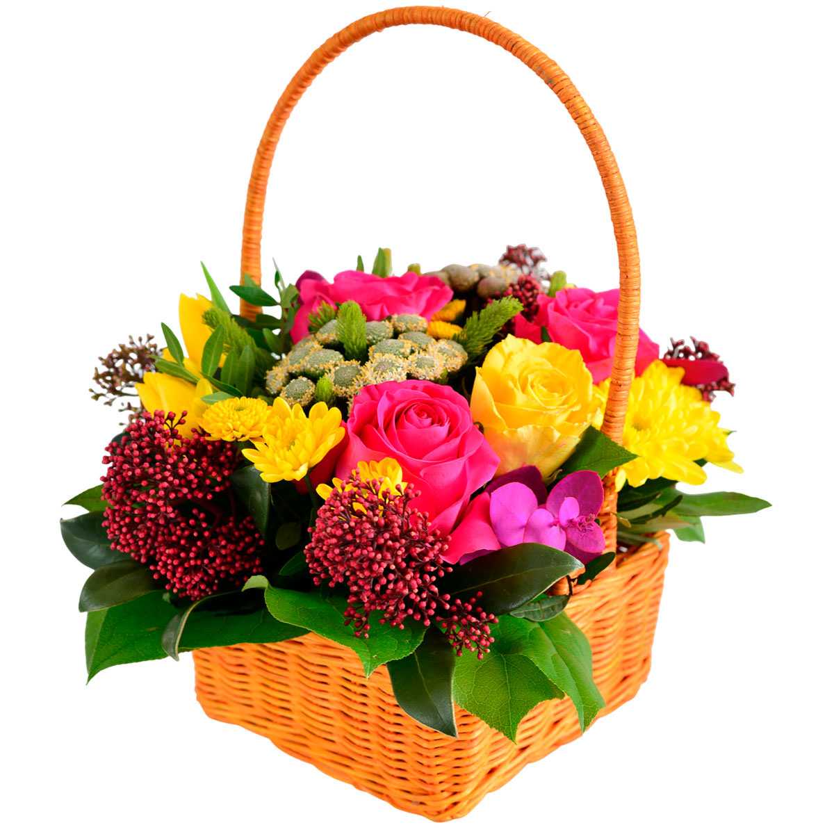 Яркая корзина с розовыми и желтыми розами, дополненная кустовой хризантемой, скимией и эвкалиптом, создает атмосферу радости и тепла. Плетёная корзина добавляет естественности и гармонии. Возможны альтернативы оформления: корзина из лозы или с тканевой отделкой. Прекрасный подарок для любимой на день рождения или юбилей.