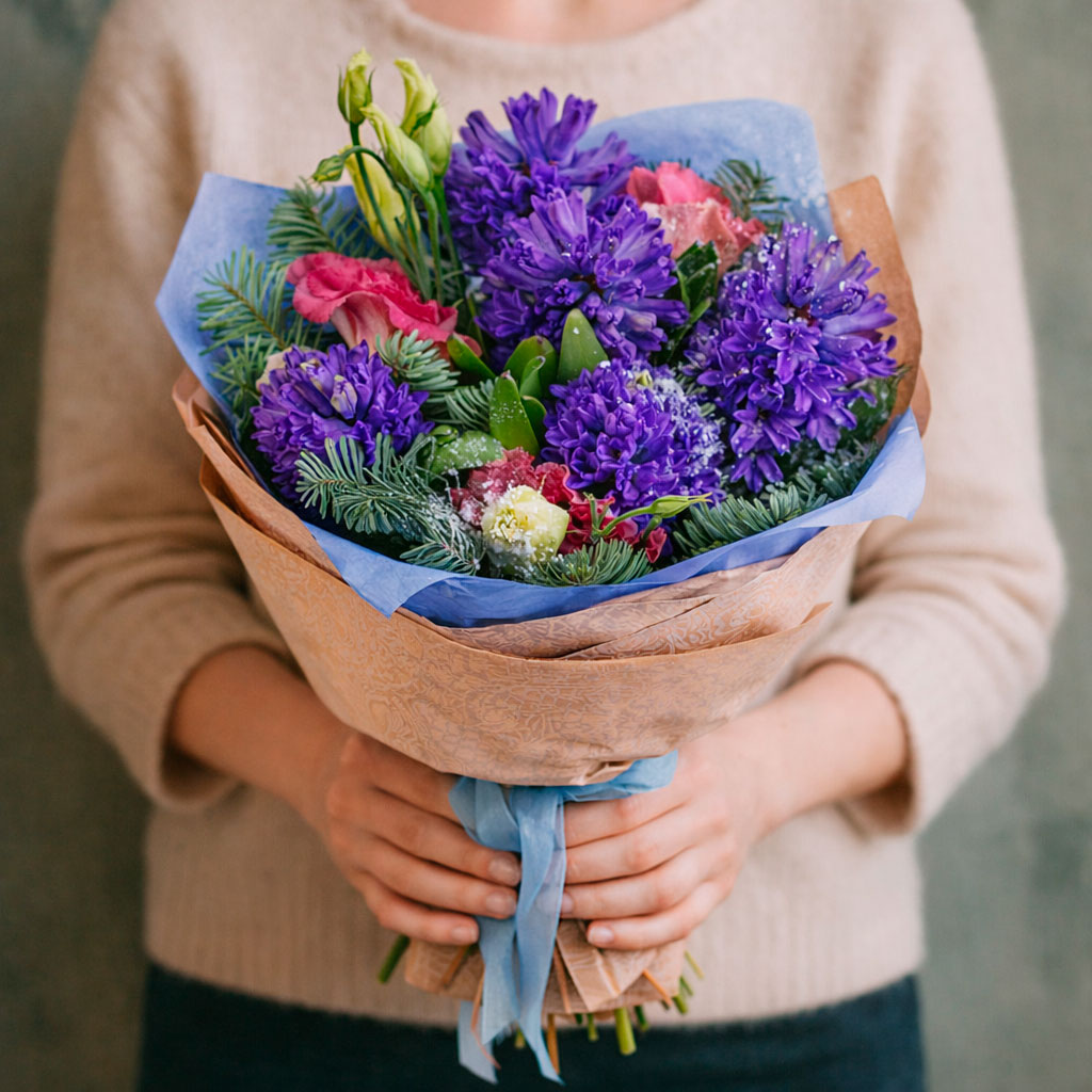 Фиолетовые гиацинты, белая и розовая эустома, а также веточки пихты создают неповторимую композицию, полную нежности и изящества. Букет перевязан голубой лентой и дополнен крафт-бумагой, что подчеркивает его природную красоту. Возможна упаковка в матовую плёнку или декоративную сетку. Прекрасный выбор для подарка на день рождения для любимой или подруги.