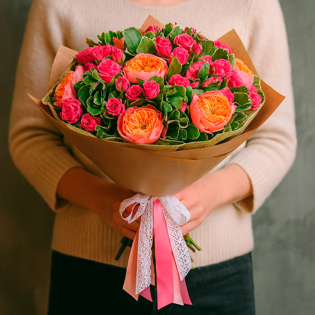 Коралловые пионовидные розы и розовые кустовые розы создают яркий и нежный ансамбль, дополненный зеленью питтоспорума. Букет оформлен в крафт-бумагу и перевязан атласной лентой. Возможны варианты с матовой плёнкой или декоративной сеткой. Прекрасный выбор для подарка на день рождения для любимой.