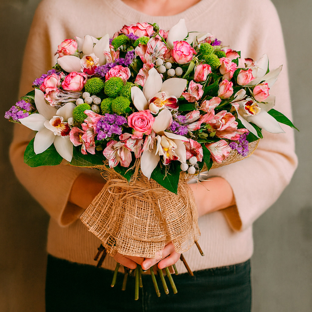 Белоснежные орхидеи, розовые кустовые розы и бело-красные альстромерии создают гармоничное сочетание с зелеными хризантемами и фиолетовой статицей. Бруния добавляет изысканности и утонченности. Букет перевязан крафтовой лентой, что придает ему естественный шарм. Возможны альтернативы: матовая пленка или декоративная сетка. Прекрасный выбор для подарка на день рождения для любимой.