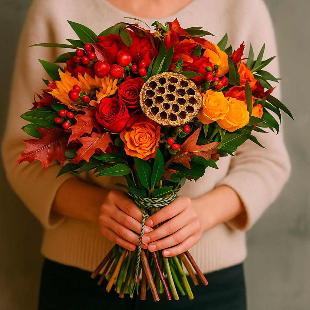 Яркий букет из подсолнухов, жёлтых и оранжевых кустовых роз, дополненный кленовыми листьями и цветком лотоса, создаёт атмосферу осеннего праздника. Упакован в матовую плёнку и перевязан лентой, он станет прекрасным подарком для любимой на день рождения. Альтернативное оформление — крафт-бумага или декоративная сетка.