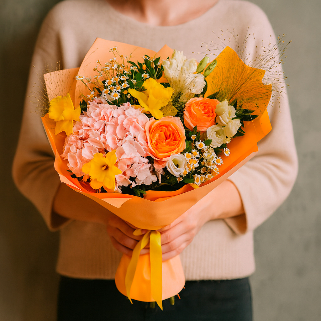 Яркие нарциссы и нежные розовые гортензии создают солнечное настроение в этом букете. Оранжевые пионовидные розы и кремовая эустома добавляют изысканности, а кустовая ромашка и зелень завершают композицию. Букет оформлен в матовую плёнку с жёлтой лентой. Возможны варианты упаковки с атласной лентой или крафт-бумагой. Прекрасный выбор для любимой на день рождения.