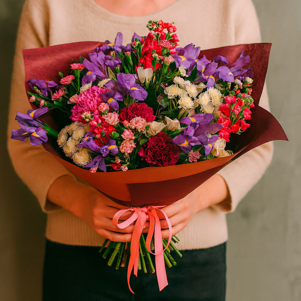 Ирисы фиолетового цвета гармонично сочетаются с красной маттиолой и темно-сиреневой гвоздикой, создавая яркий акцент. Кремовые кустовые гвоздики и розы добавляют нежности, а ромашки и зелень завершают композицию. Букет оформлен в матовую пленку и перевязан розовой лентой. Возможны варианты упаковки в крафт-бумагу или декоративную сетку. Прекрасный выбор для подарка на день рождения для любимой.