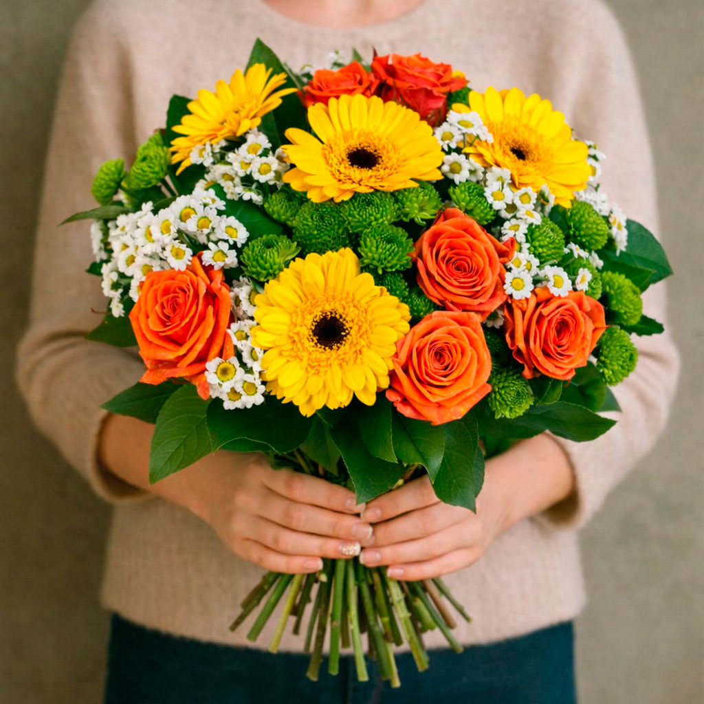 Яркие желтые герберы и оранжевые розы создают солнечное настроение, а зеленые хризантемы и нежные ромашки добавляют свежести. Букет перевязан лентой и оформлен в матовую пленку. Возможны альтернативы: крафт-бумага или декоративная сетка. Подойдет для подарка на день рождения для любимой.