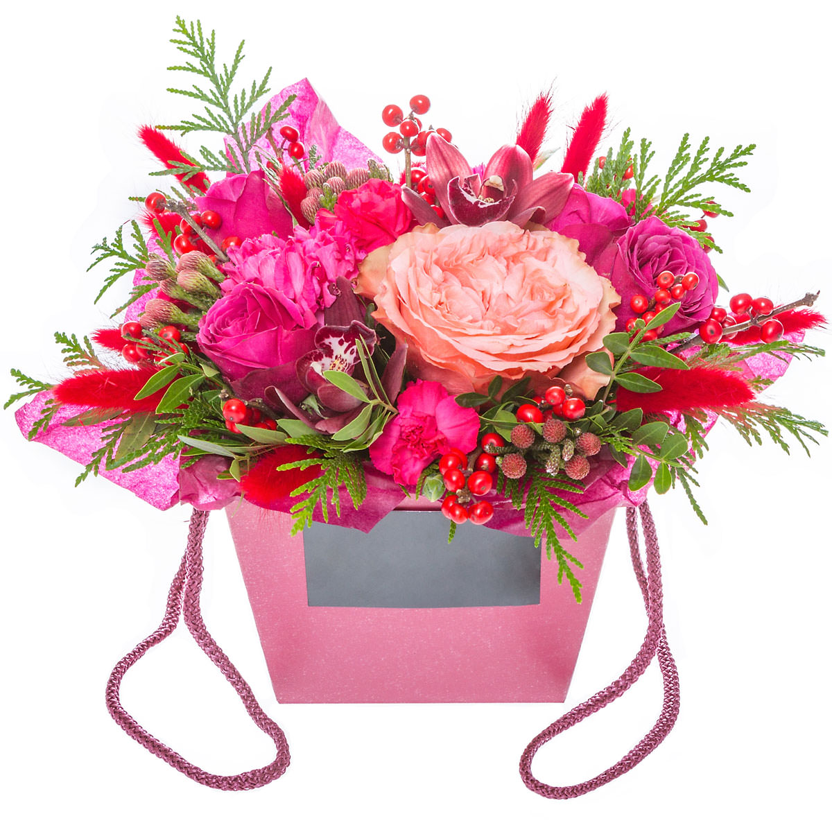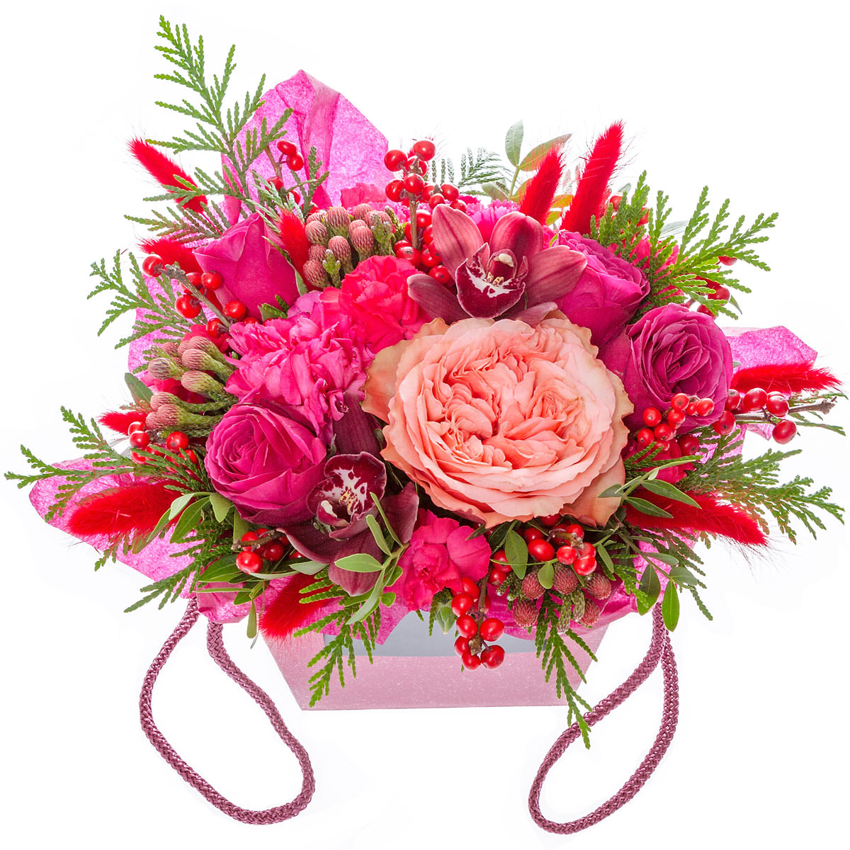 | Состав: | Илекс, Розы, Гвоздики, Орхидеи, Пионовидные розы |