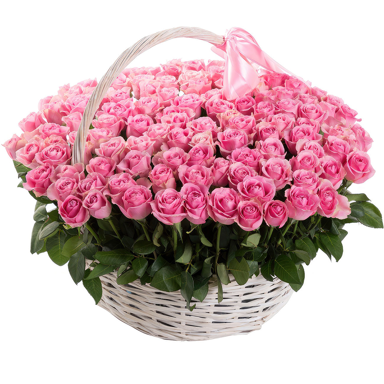 Роскошная композиция из розовых одноголовых роз в плетёной корзине создаёт атмосферу нежности и утончённости. Белая корзина украшена розовой лентой, подчёркивая изысканность оформления. Альтернативы: корзина из ротанга, корзина с тканевой отделкой. Прекрасный подарок для любимой на годовщину или день рождения.