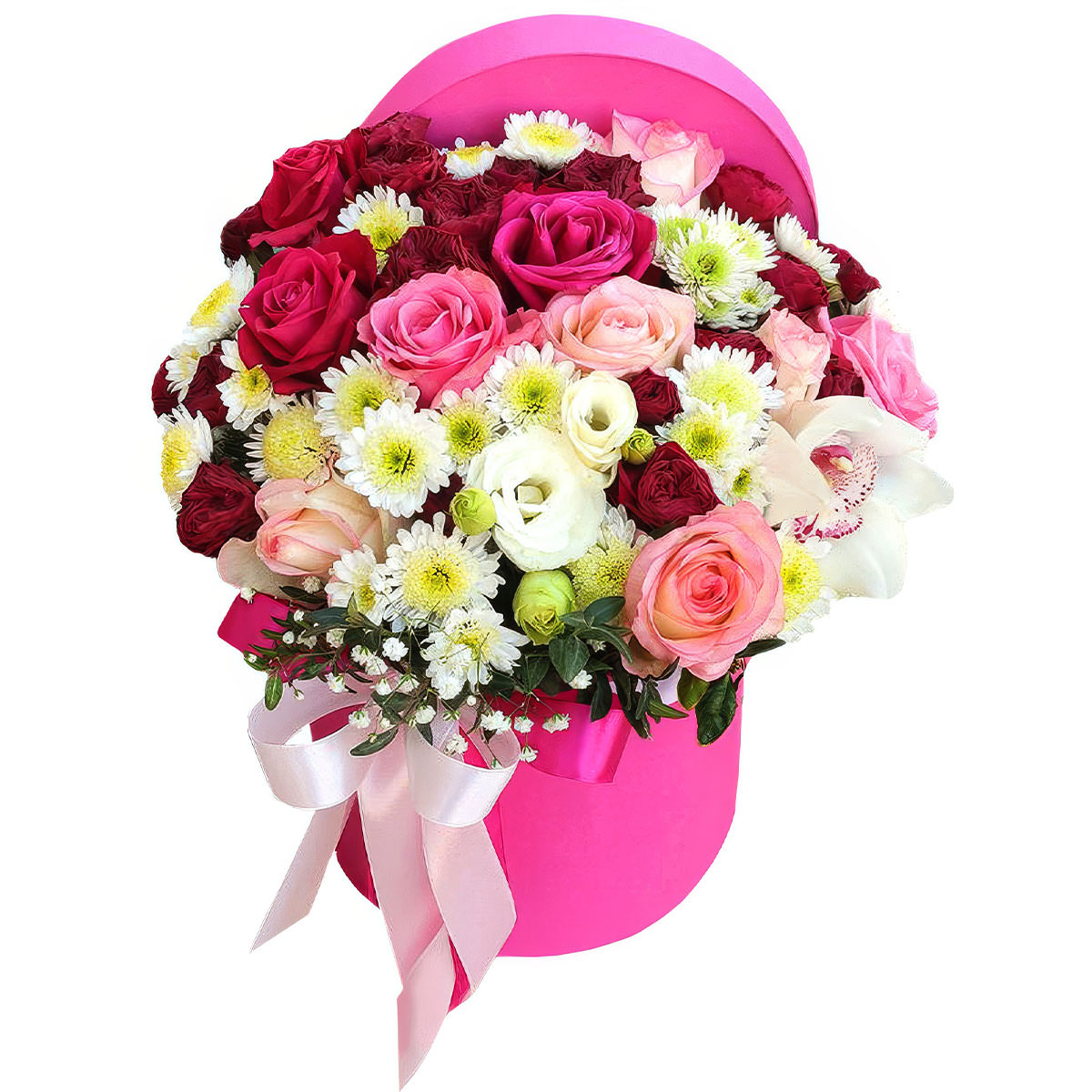 Роскошная композиция из розовых и бордовых роз, белых орхидей и хризантем, дополненная гипсофилой и зеленью, создаёт атмосферу нежности и элегантности. Яркая шляпная коробка розового цвета подчёркивает изящество букета. Возможны альтернативы оформления: бархатная коробка или коробка в форме сердца. Прекрасный подарок для любимой на день рождения или годовщину.