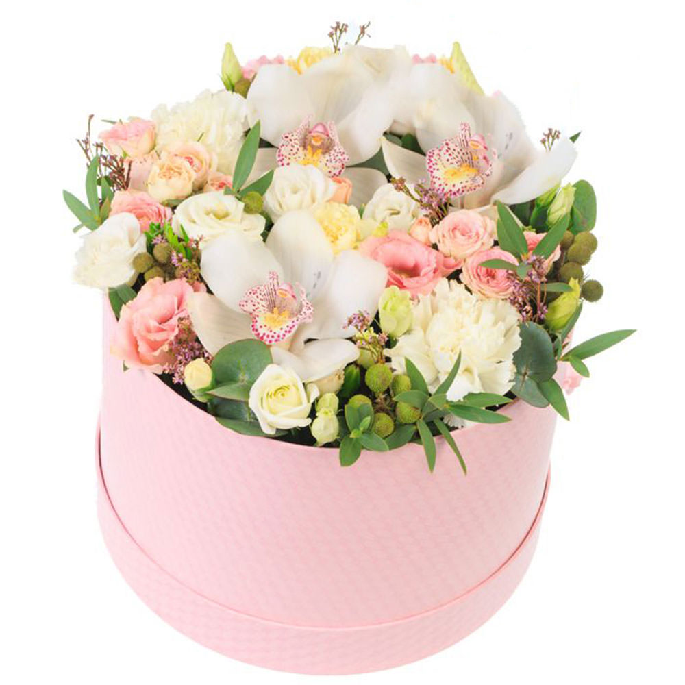Белоснежные орхидеи, розовые кустовые розы и эустомы создают нежную композицию, дополненную брунией и фисташкой. Цветы оформлены в изысканной розовой шляпной коробке, подчеркивающей их утонченность. Возможны альтернативы в виде бархатной или атласной коробки. Подходит для подарка на годовщину или для любимой.