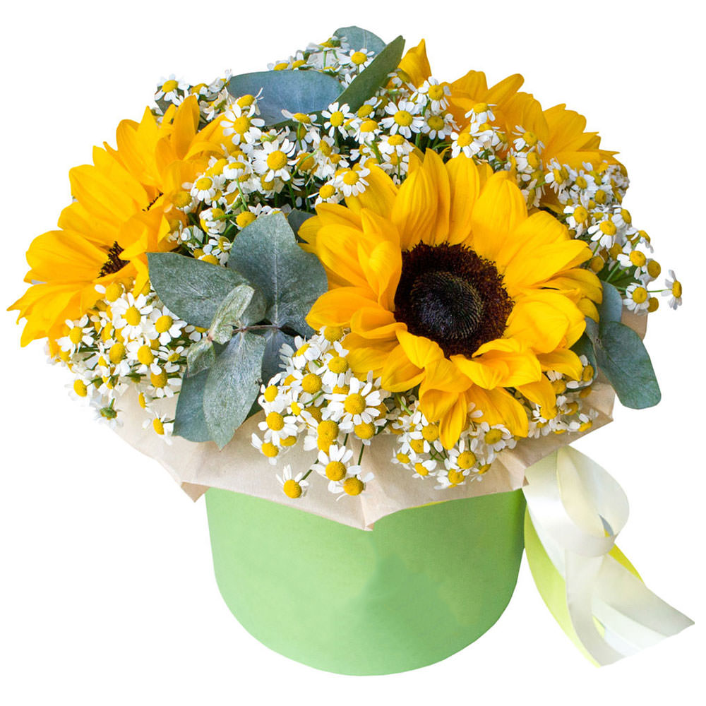 Яркие подсолнухи, обрамлённые нежным танацетумом и зеленью эвкалипта, создают солнечное настроение. Композиция оформлена в стильной зелёной шляпной коробке, подчёркивающей природные оттенки. Возможны альтернативы оформления в бархатной или атласной коробке. Прекрасный подарок для любимой на день рождения или годовщину.