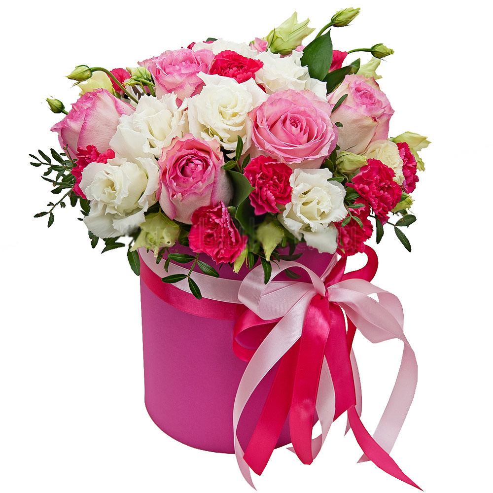 Изящная композиция из розовых одноголовых роз, миниатюрных розовых кустовых гвоздик и белоснежных эустом, дополненная свежей фисташкой, создаёт атмосферу нежности и утончённости. Цветы расположены в яркой розовой шляпной коробке, перевязанной атласной лентой. Альтернативные варианты оформления: бархатная коробка или коробка с принтом. Прекрасный выбор для подарка на день рождения или для любимой.