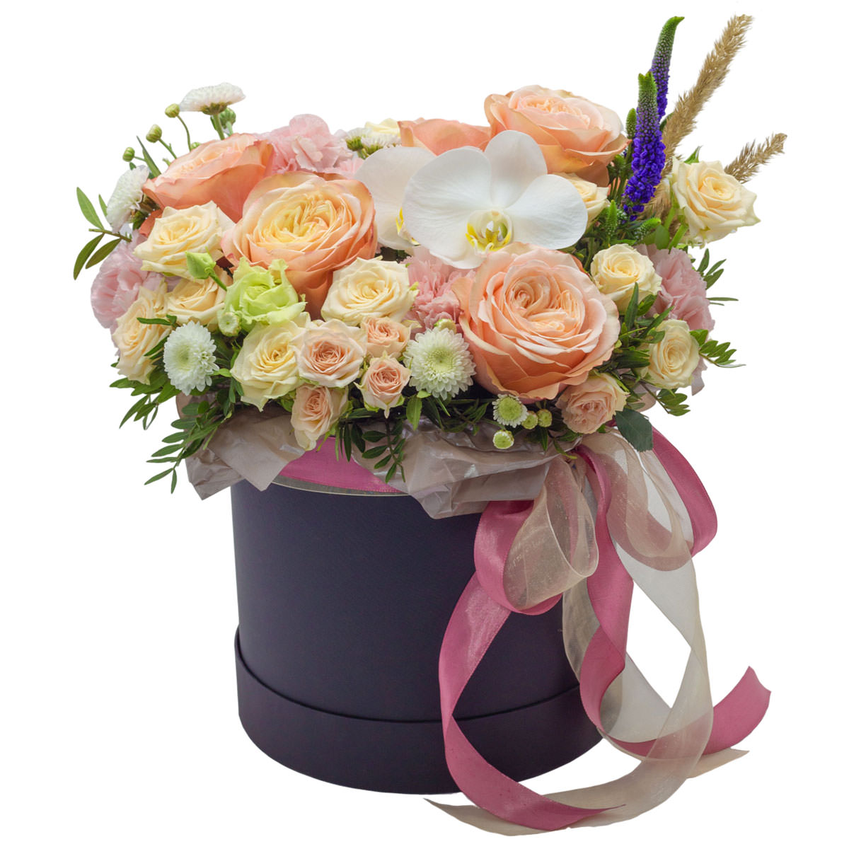 Элегантная композиция из белой орхидеи, персиковых и кремовых роз, белой мини-хризантемы, розовой эустомы и гвоздики, дополненная вероникой и сухоцветами. Цветы оформлены в стильной шляпной коробке с розовой лентой. Возможны варианты оформления в бархатной или атласной коробке. Прекрасный подарок для любимой на день рождения или годовщину.