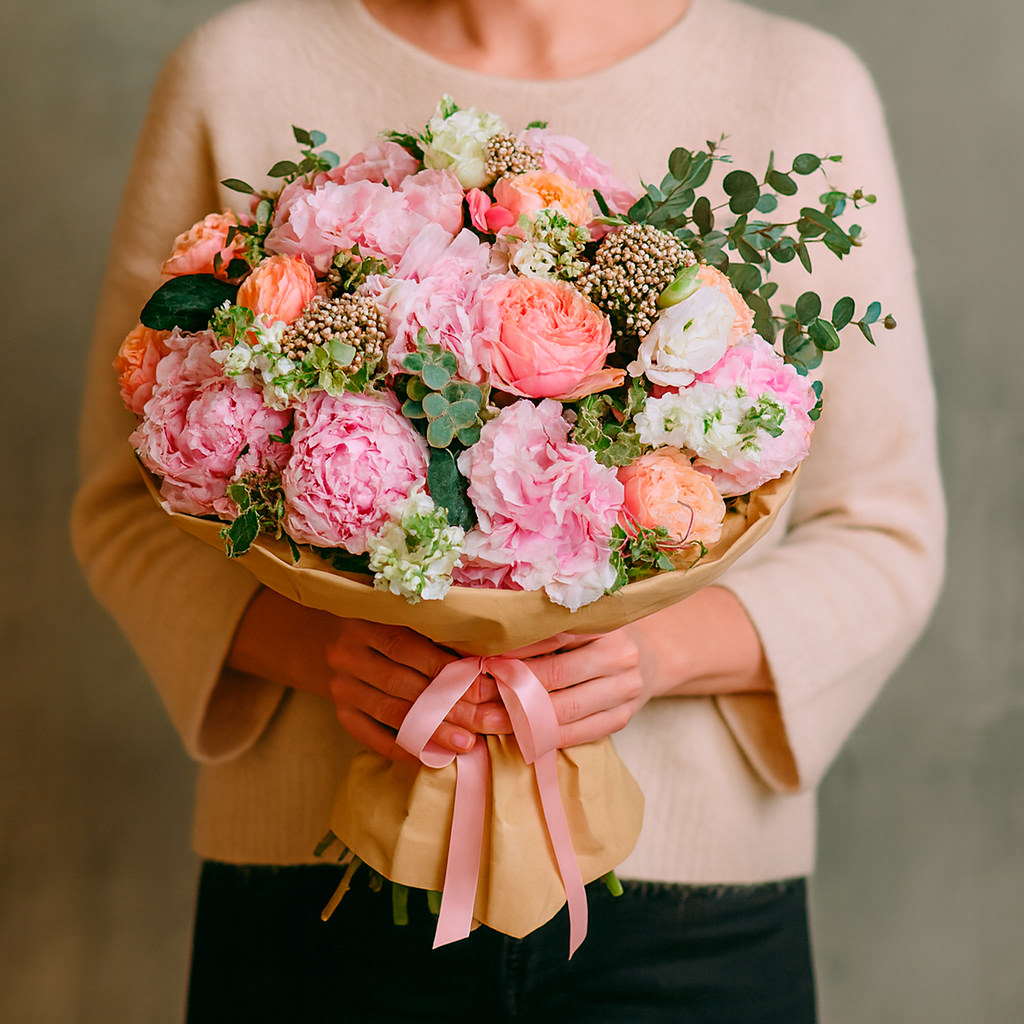Роскошный букет сочетает в себе розовые пионы, персиковые пионовидные розы и нежную розовую гортензию, дополняемые белой маттиолой и эустомой. Эвкалипт и озотамнус придают композиции свежесть и изысканность. Упакован в крафт-бумагу с розовой атласной лентой. Возможны альтернативы оформления: матовая плёнка или декоративная сетка. Прекрасный выбор для подарка на годовщину для любимой.