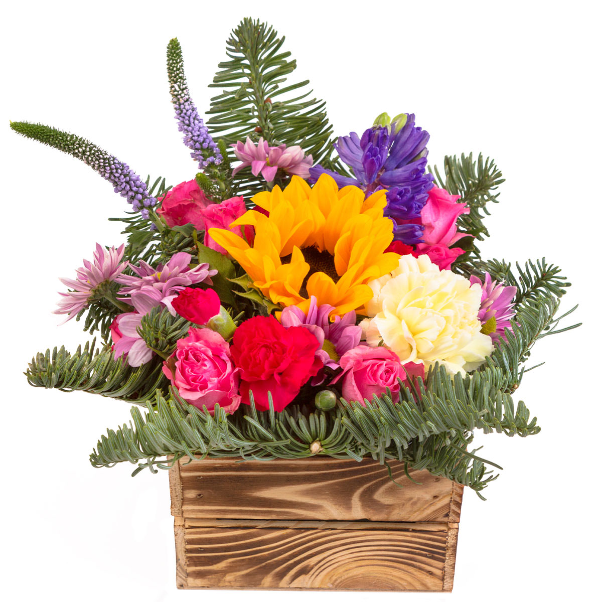 Яркая композиция из подсолнуха, белой и красной гвоздики, сиреневой хризантемы, розовой розы, вероники и пихты создаёт атмосферу праздника. Цветы размещены в стильной деревянной корзине, придающей композиции естественность и уют. Возможны варианты оформления с плетёной корзиной или корзиной из ротанга. Прекрасный подарок для любимой на день рождения или годовщину.