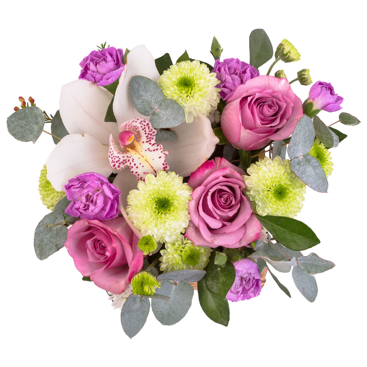 | Состав: | Розы, Эвкалипт, Гвоздики, Орхидеи, Хризантемы |