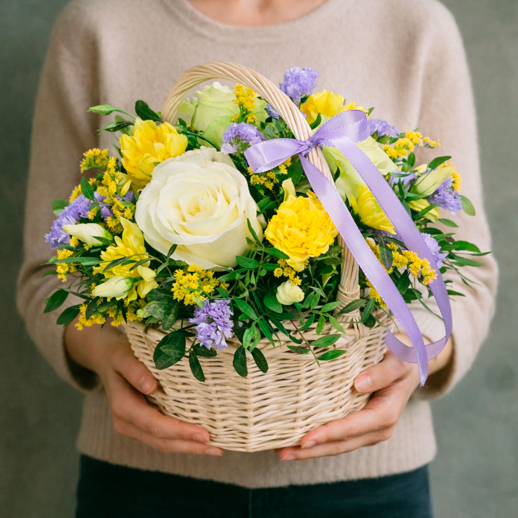 Эта цветочная композиция сочетает в себе белые одноголовые розы, нежные фрезии, яркие солидаги, жёлтые кустовые хризантемы, фисташку и изящную статицу. Корзина выполнена из светлого плетёного материала и украшена лавандовой лентой. Возможны альтернативы оформления: корзина из лозы или с тканевой отделкой. Подходит для подарка на 8 марта или для любимой.